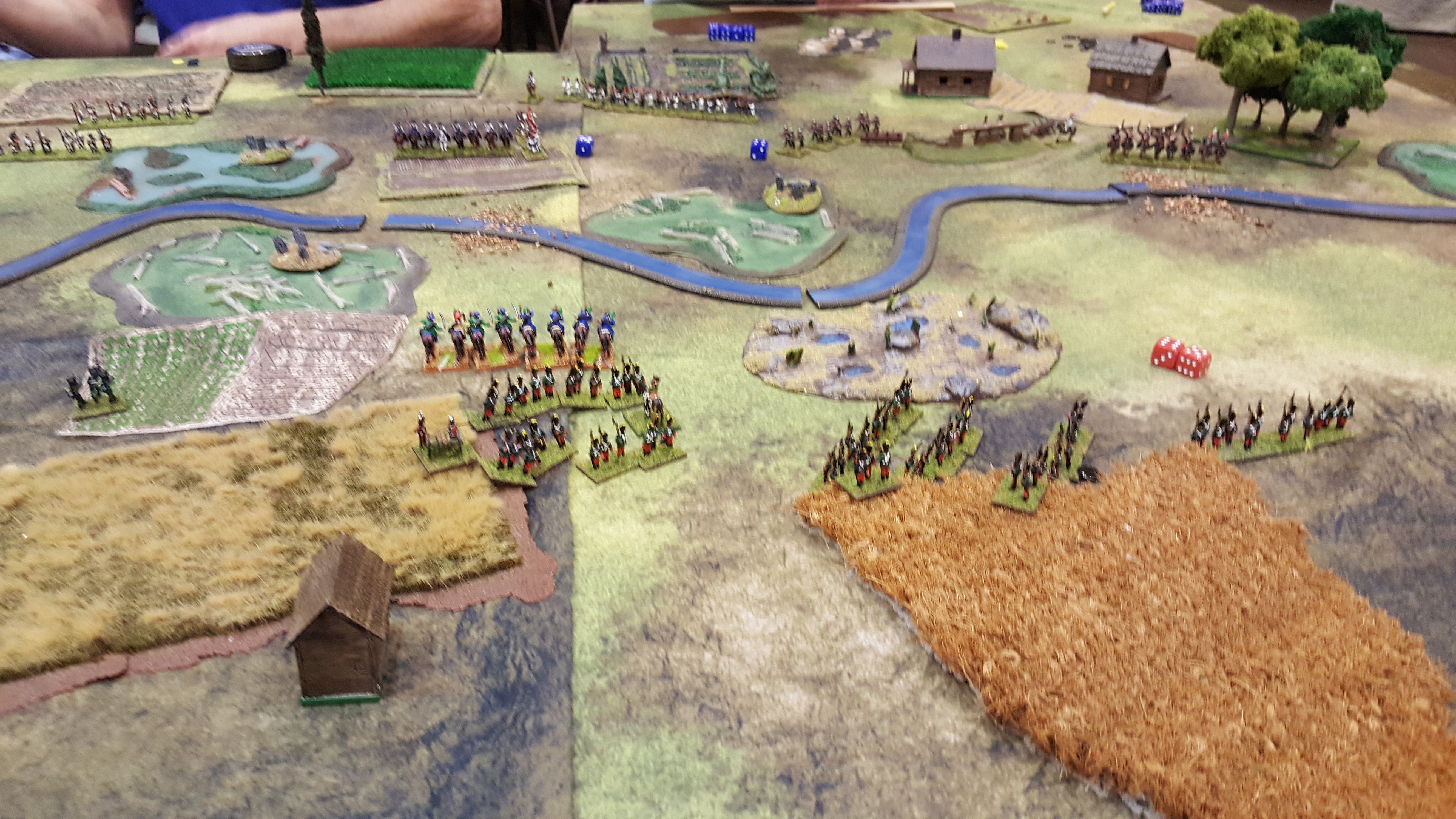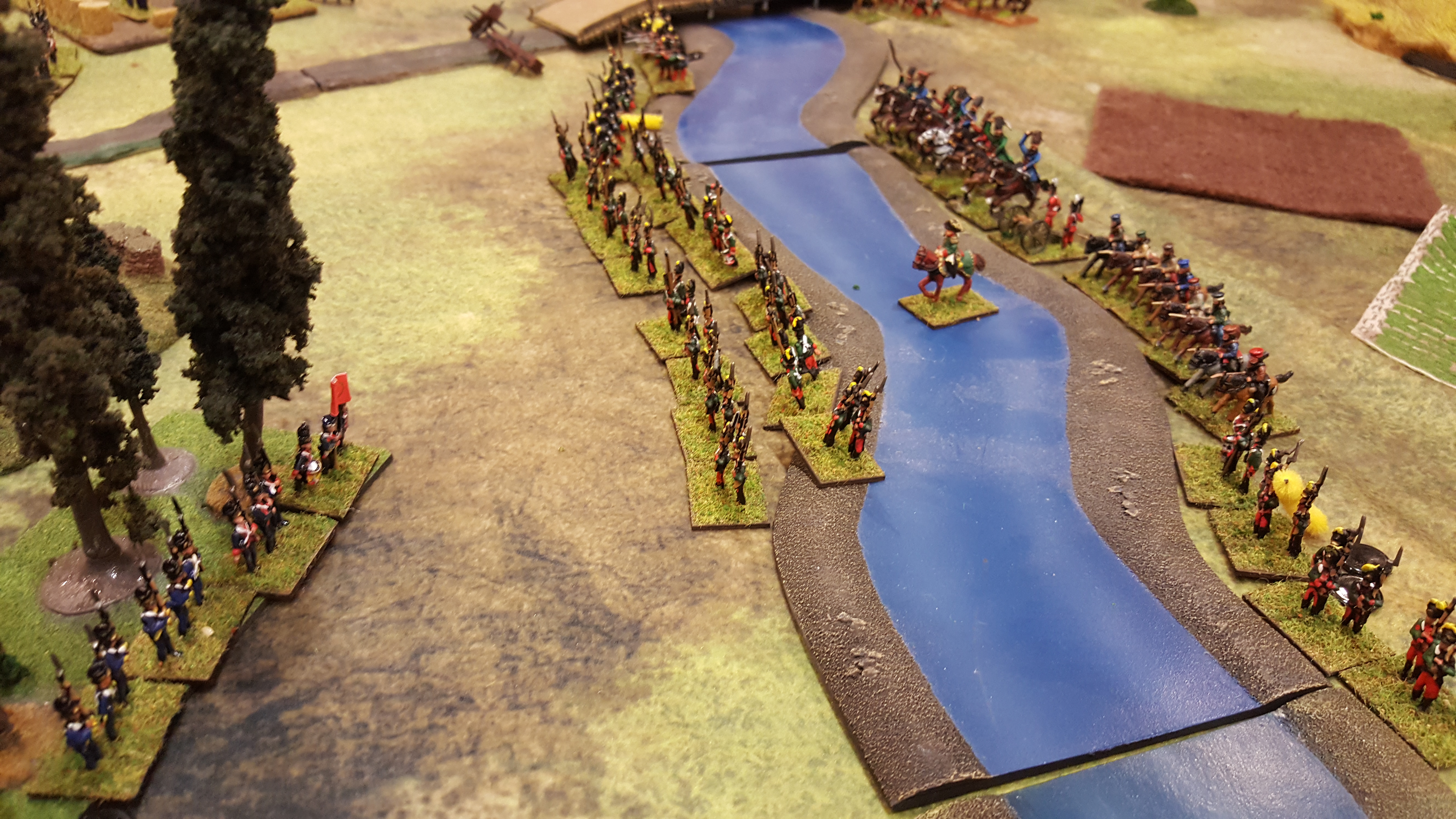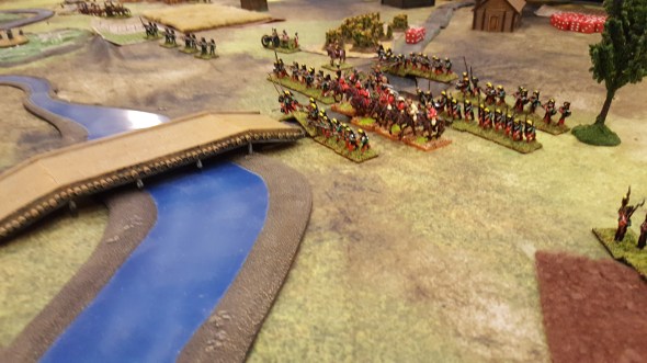 The Russian center approaches the river bridge across from the main redoubt and the village.
