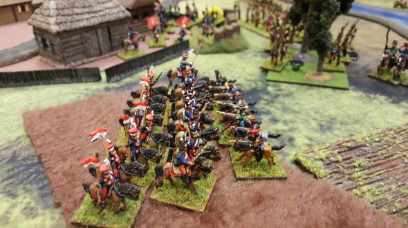 The climactic clash of my Polish Dragoons and lancers driving back the left wing Russian light cavalry. The village was still in Polish hands at the end of three hours. This was a late Friday night game and a couple of our players needed rest.