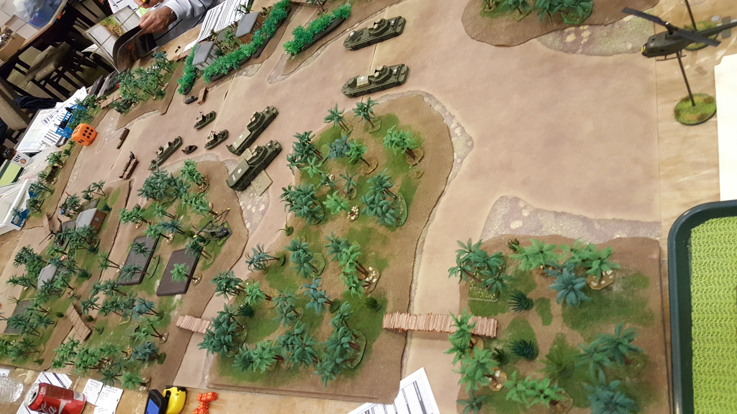 This riverine Flames of War Vietnam game was making at least it’s second appearance at Little Wars. I’m confident of that because after I saw it last year I went and bought much of the same terrain, boats, figures. This is one of those games that was pure inspiration for me. I’m not sure about the rules frankly, but the hardware, miniatures and concept are very on target for me