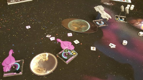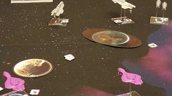 I can only turn 45 degrees per turn so it will be a broadsides encounter from here with the planet and planetoid interfering with arcs of fire.