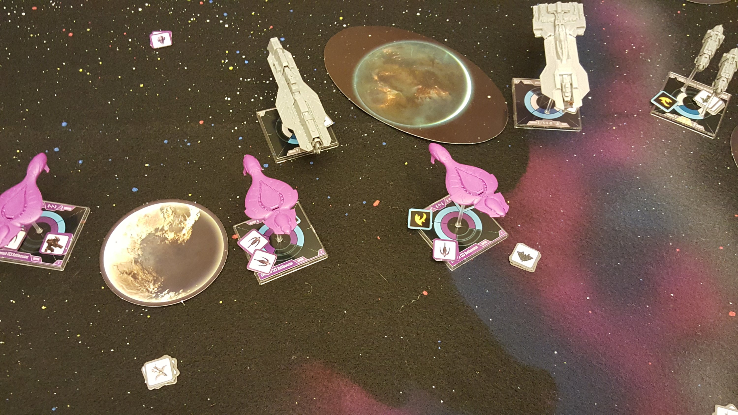 Turn one saw the heavy UNSC advantage in fighters as they swarmed forward. No hits in either fleet but my right flank cruiser took a vulnerability…