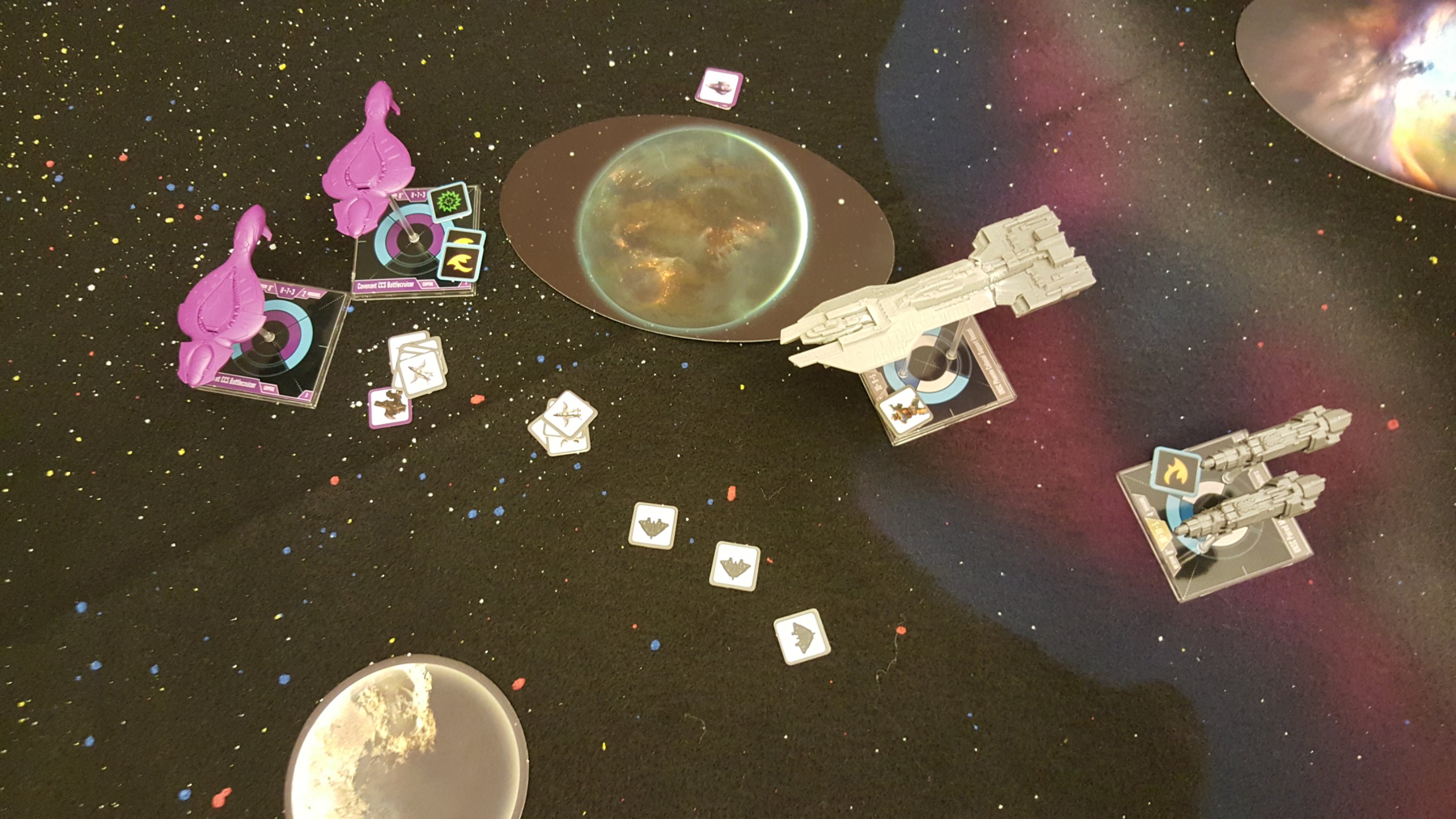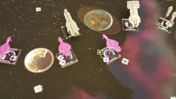 The turn climaxed when the Minister himself in the left flank battlecruiser launched a devastating volley into the carrier and the admiral failed to defend any of the hits – kaboom!!! He failed his roll to remove damage as well. The admiral was more than a little unhappy.