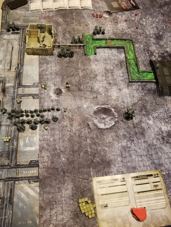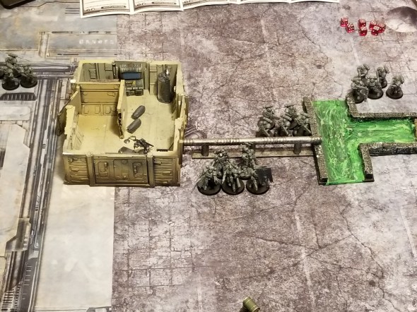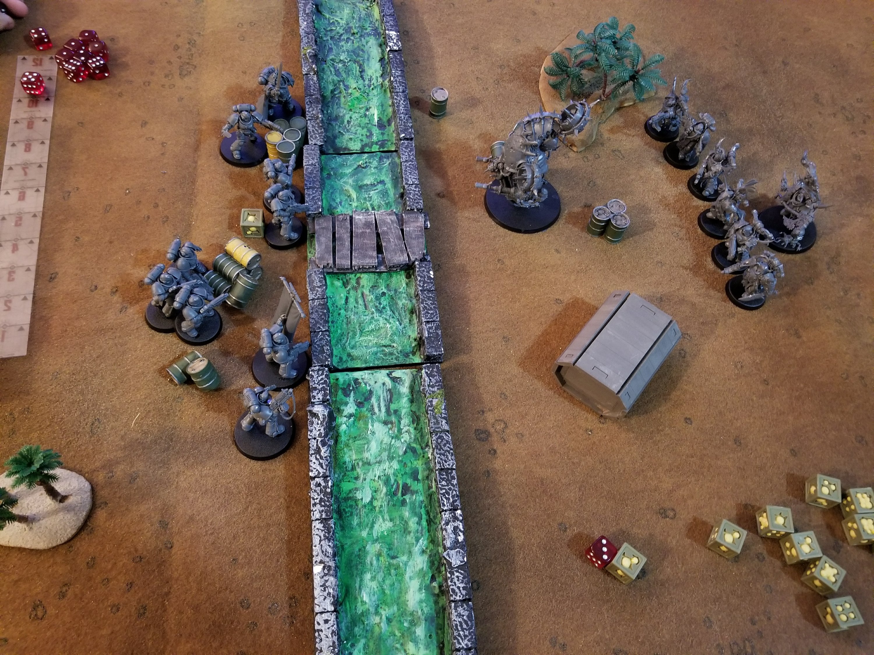 I sent the Bloat drone to the right flank toward the squad of Marines and the bridge- hoping to get to isolate one or maybe more of the powerful marine squads. The drone is resilient with ten hits, but not terribly effective in shooting. As it is, this never played out.