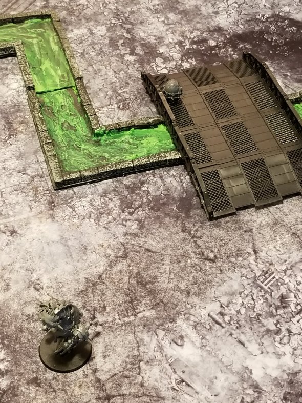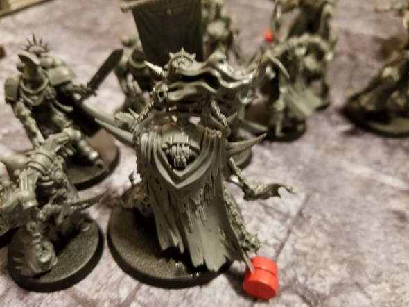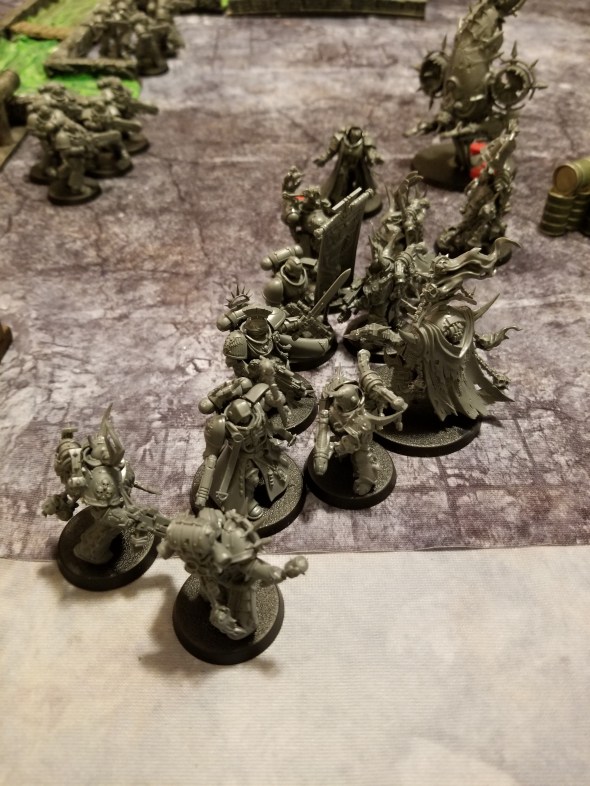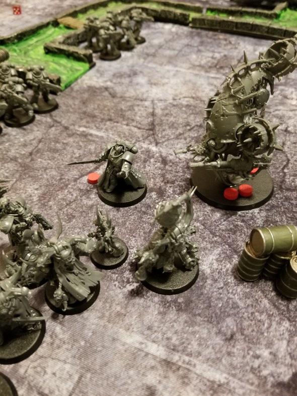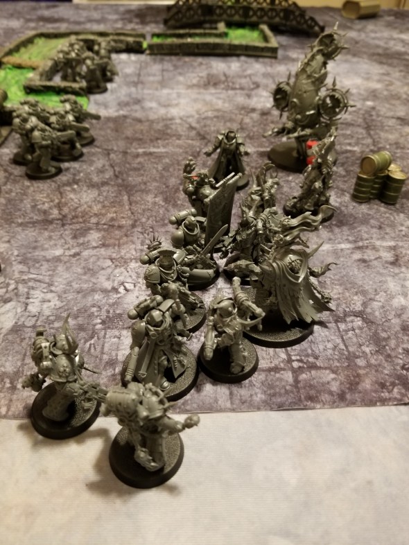 You can see my deployment above – poxwalkers screening my chaos marines, blightbringer, captain, and caster. The objective was a fortified lab with tech. My force was rounded out with the bloat drone on my right flank. More on that later.