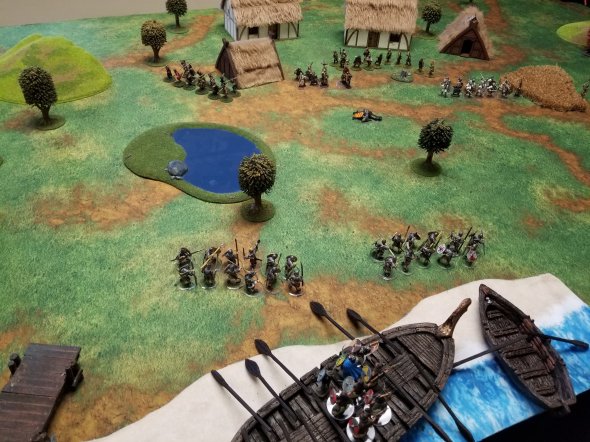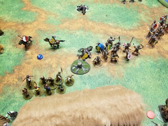 So a quick summary – my son had the Danes – one half unit of berserkers (mean-ar-arms), twi units of warriors with decent armor (foot sergeants) and one unit of cavalry (mtd. Sergeants).