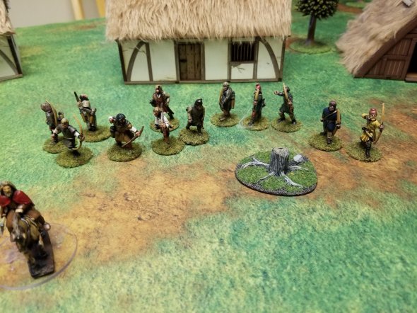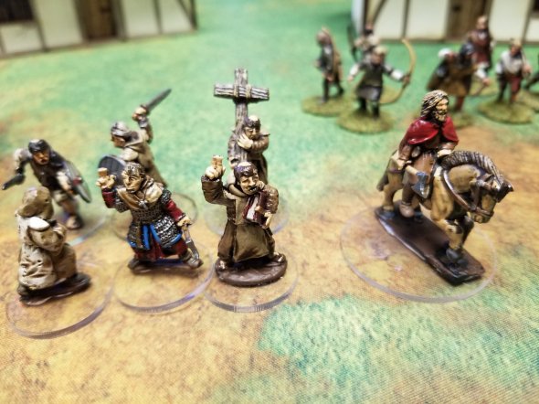 My defenders were somewhat over-matched as I had one unit of warriors for my shieldwall (foot sergeants), one unit of archers (archers), one unit of levy militia (foot yeoman) and a half unit of warrior monks (foot yeoman).