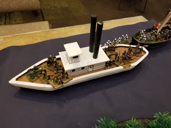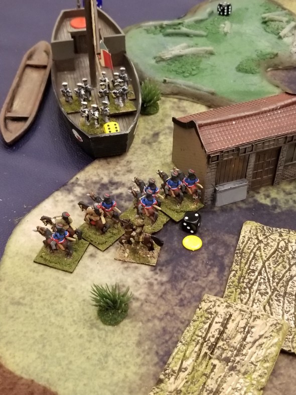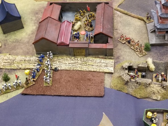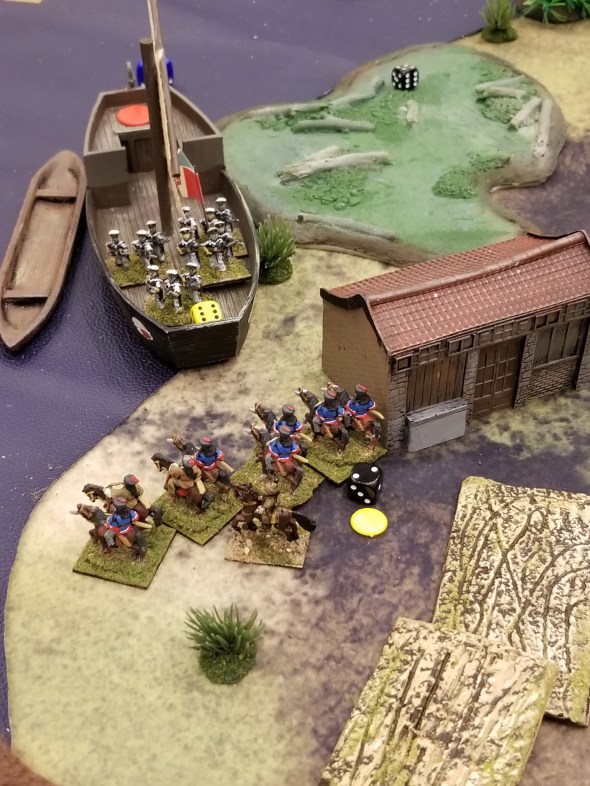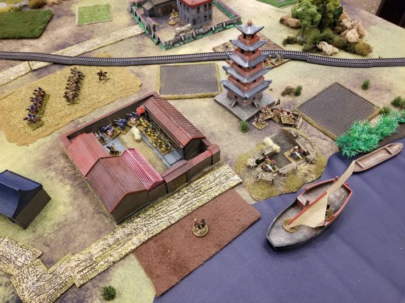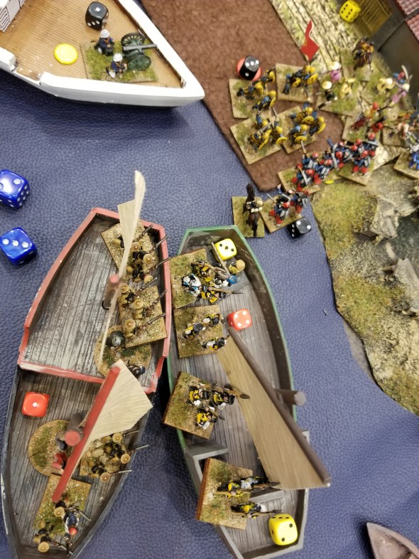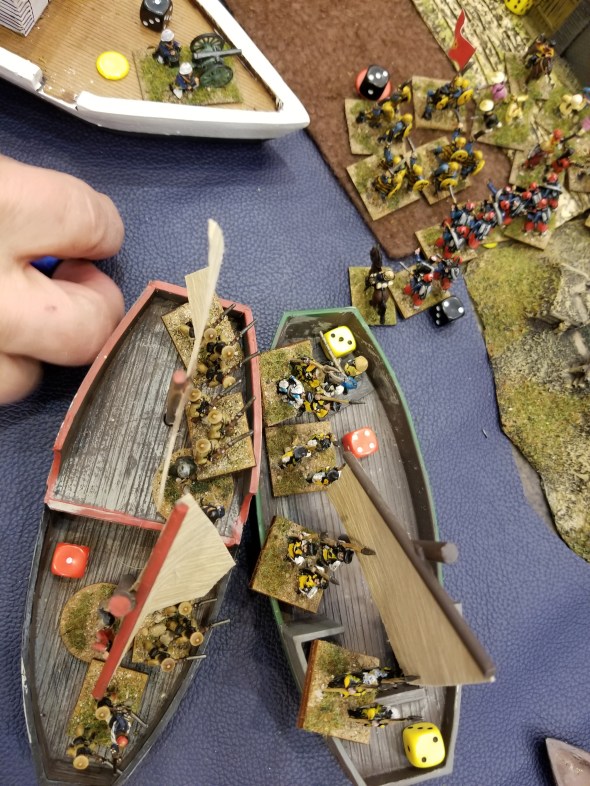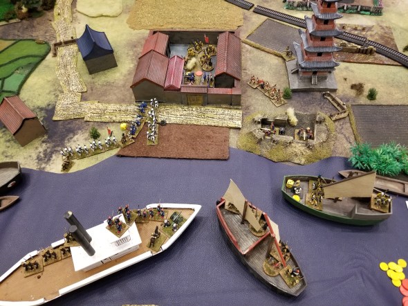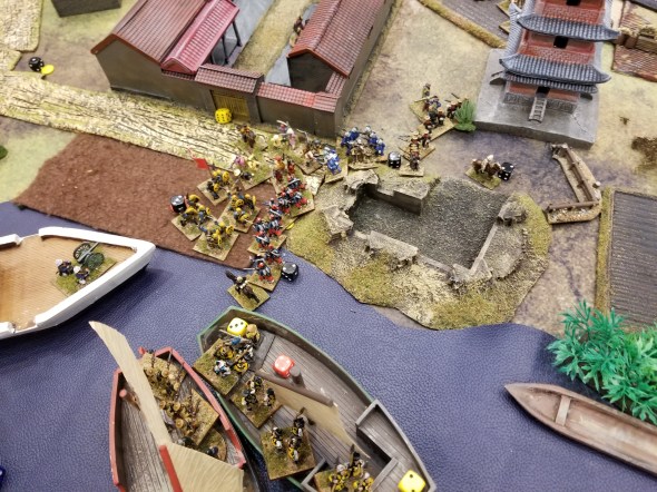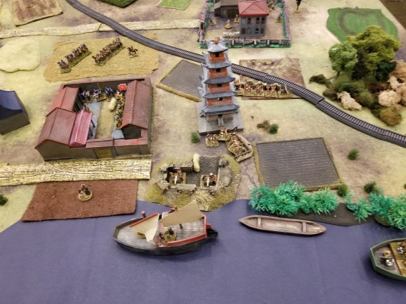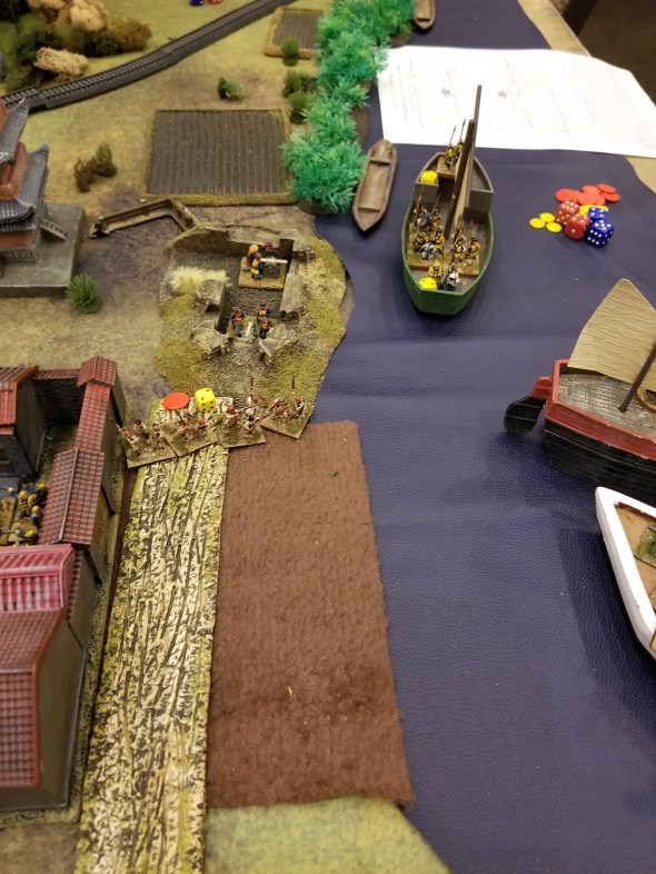 An actual boarding action on the junks in the river – this actually seesawed for three turns….