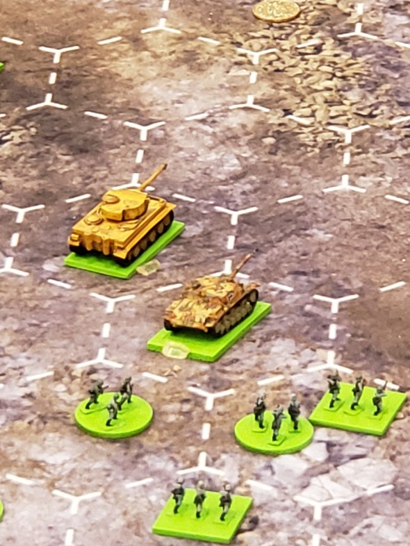 Though KAMERADEN is certainly not chess or golf, it is, as I like to say, “easy to play, but hard to play well.” Though KAMERADEN is biased to the Eastern Front of World War II, the rules are easily adaptable to all the war’s fronts.Minitanks, 20,15,12,10mm and 1/285 miniatures all work very well. You do need a hex map (“cigar box” map company or other companies) or a “brick type” pattern (which you can sketch out on a piece of indoor carpeting or on sheets of plywood (like I did years before hex mats were available).