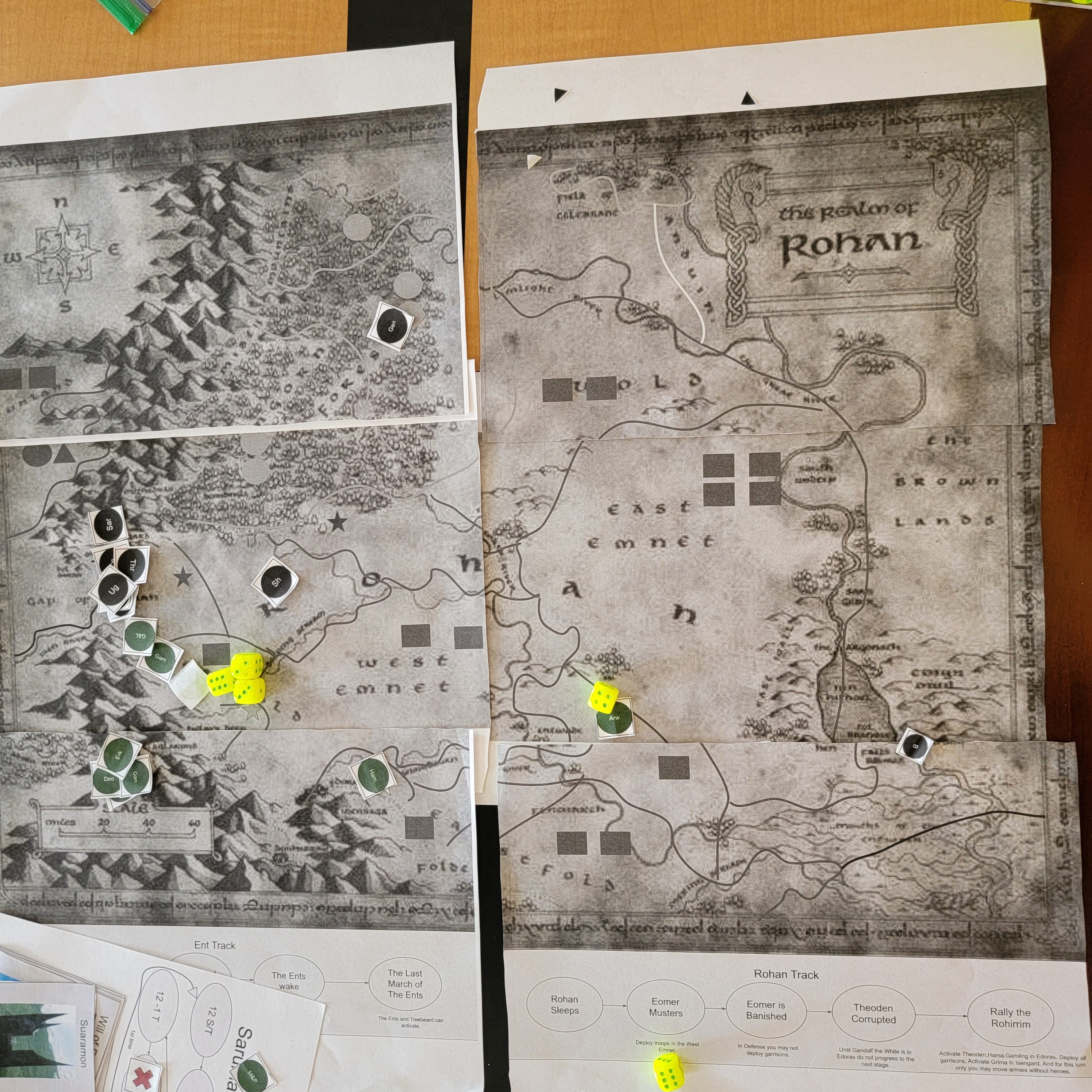 Some bad things happened – one party of orcs managed to wipe out all of the ents by attacking Fangorn Forest. We only played for two hours, and the combat rules were tweaked often, but the scale of the game preparation, clever design etc was really impressive to me.