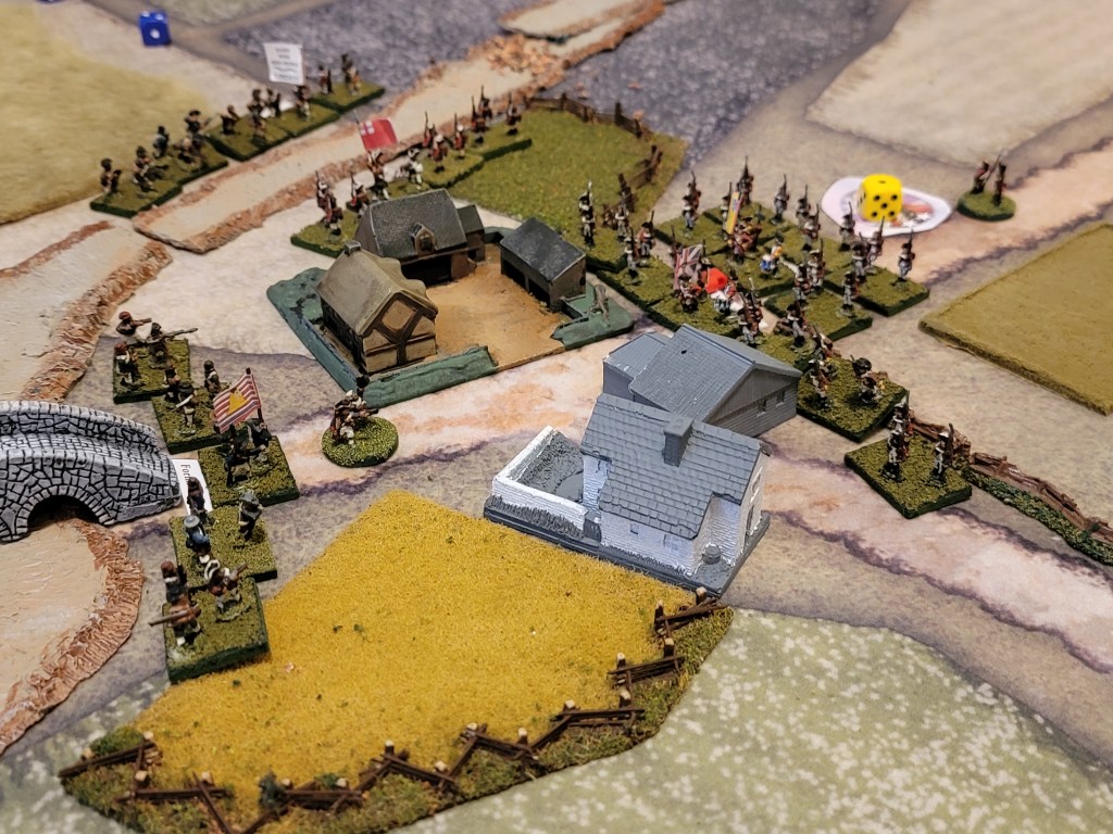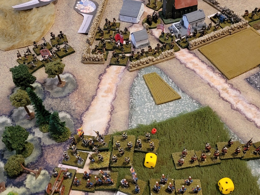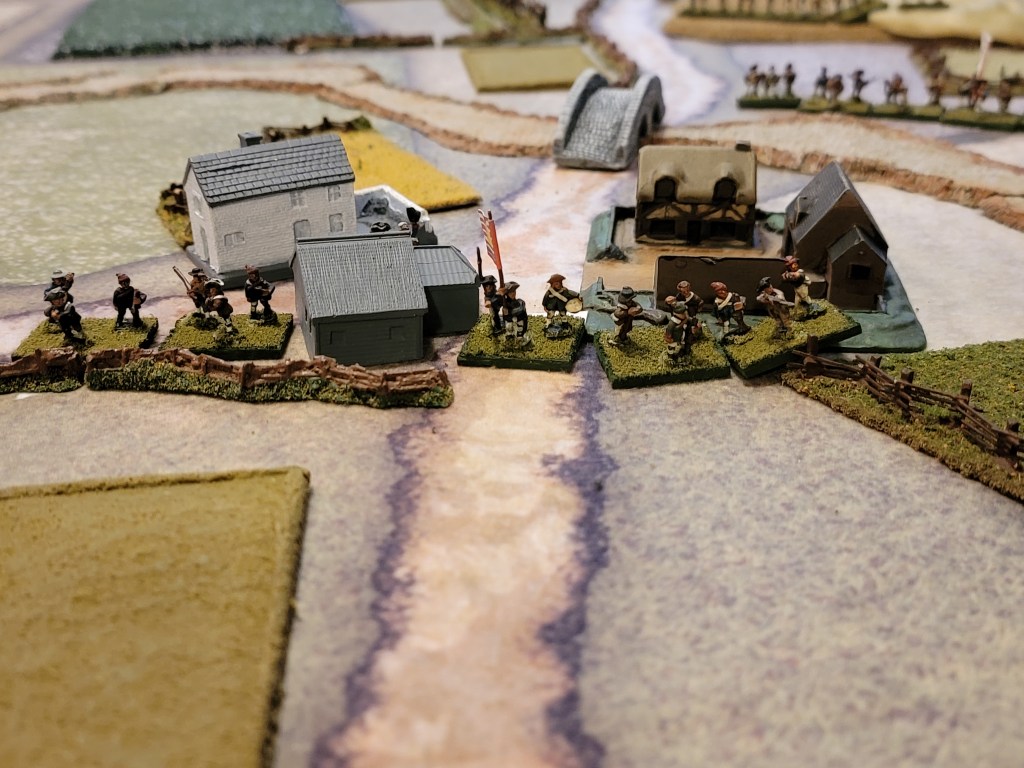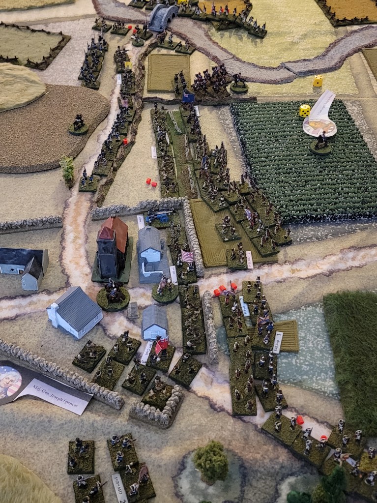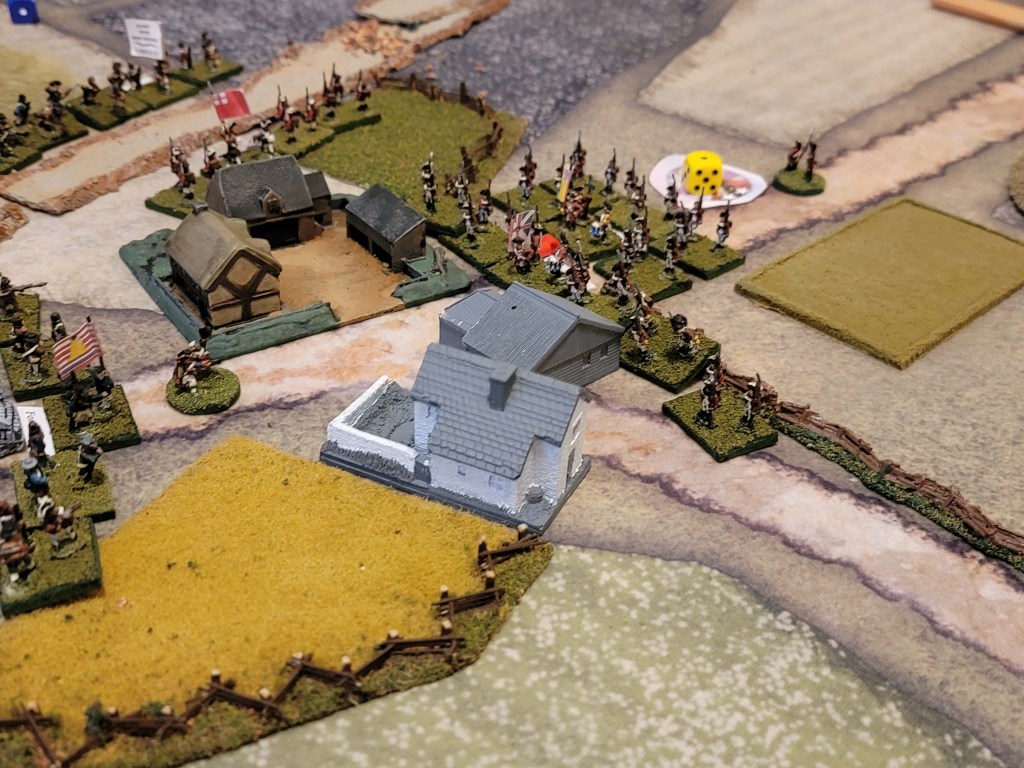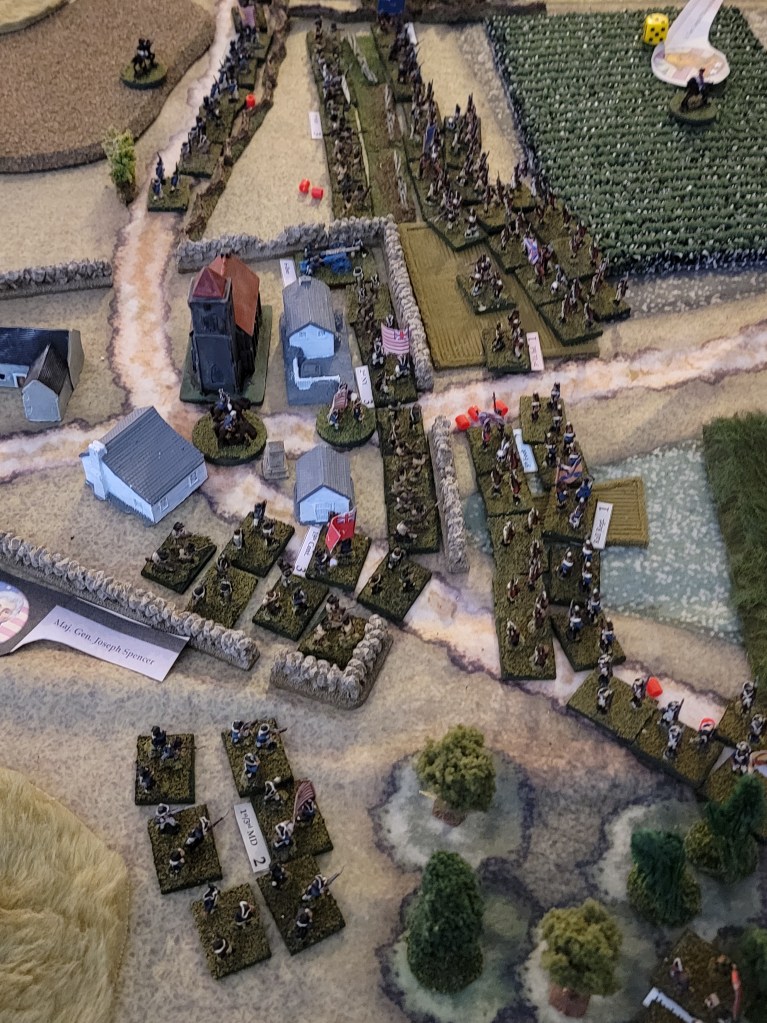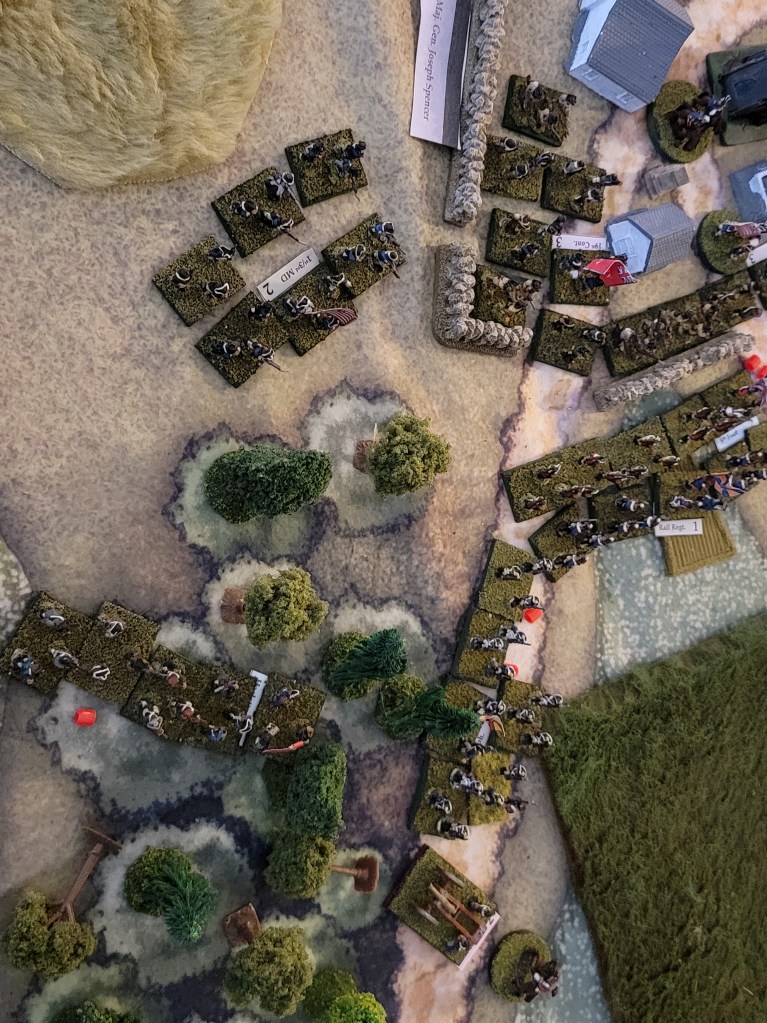 As usual, I don’t have a ton of time to describe the play by play but I did want to share the images. In short, the British (commanded by me) rushed toward Sutton, using the single battalion of lights to screen my battalions, with von Rall’s brigade securing the left along the woods. In the east around Compton’s Corner, Leslie rushed headlong to displace the one battalion of MA militia across the river. Of all the British brigades Leslie had the most success.