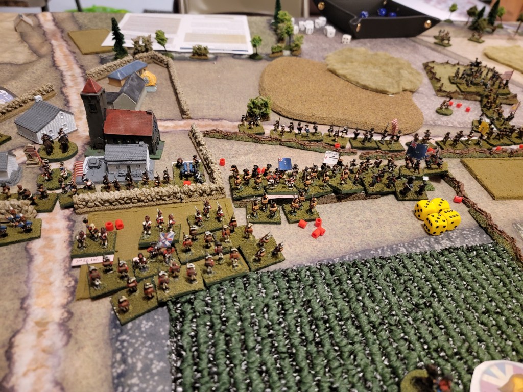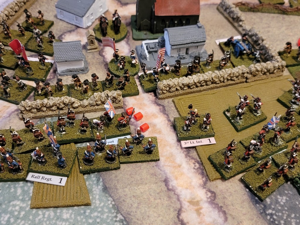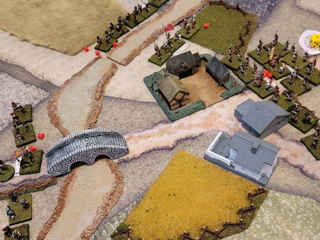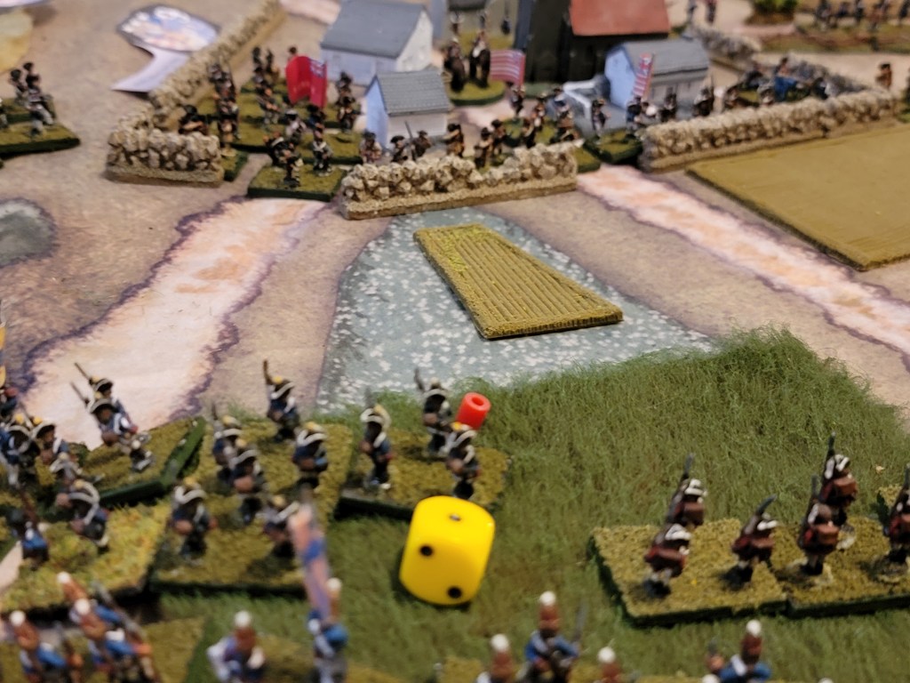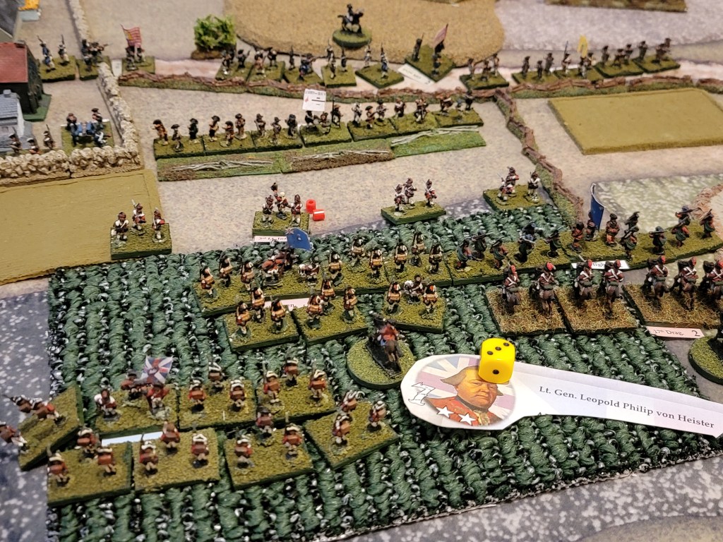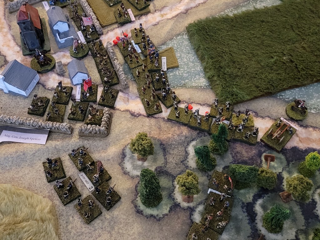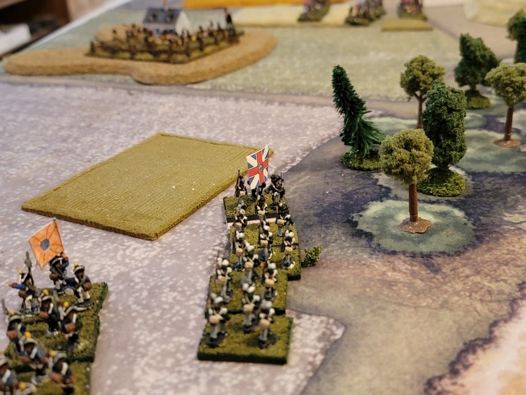 As usual, I don’t have a ton of time to describe the play by play but I did want to share the images. In short, the British (commanded by me) rushed toward Sutton, using the single battalion of lights to screen my battalions, with von Rall’s brigade securing the left along the woods. In the east around Compton’s Corner, Leslie rushed headlong to displace the one battalion of MA militia across the river. Of all the British brigades Leslie had the most success.