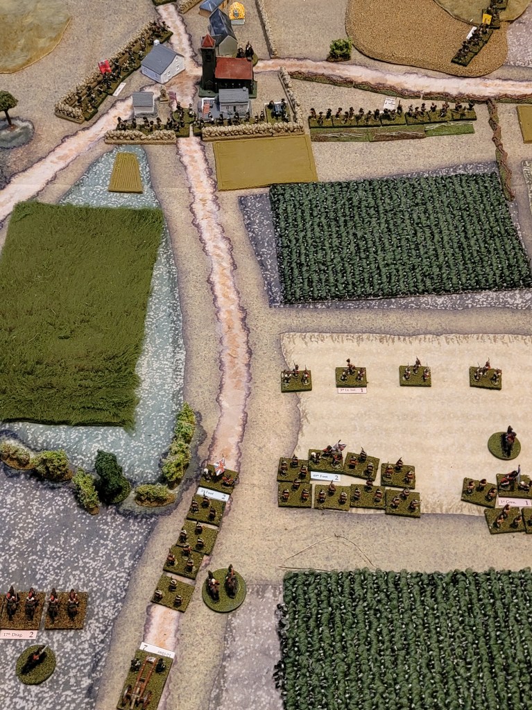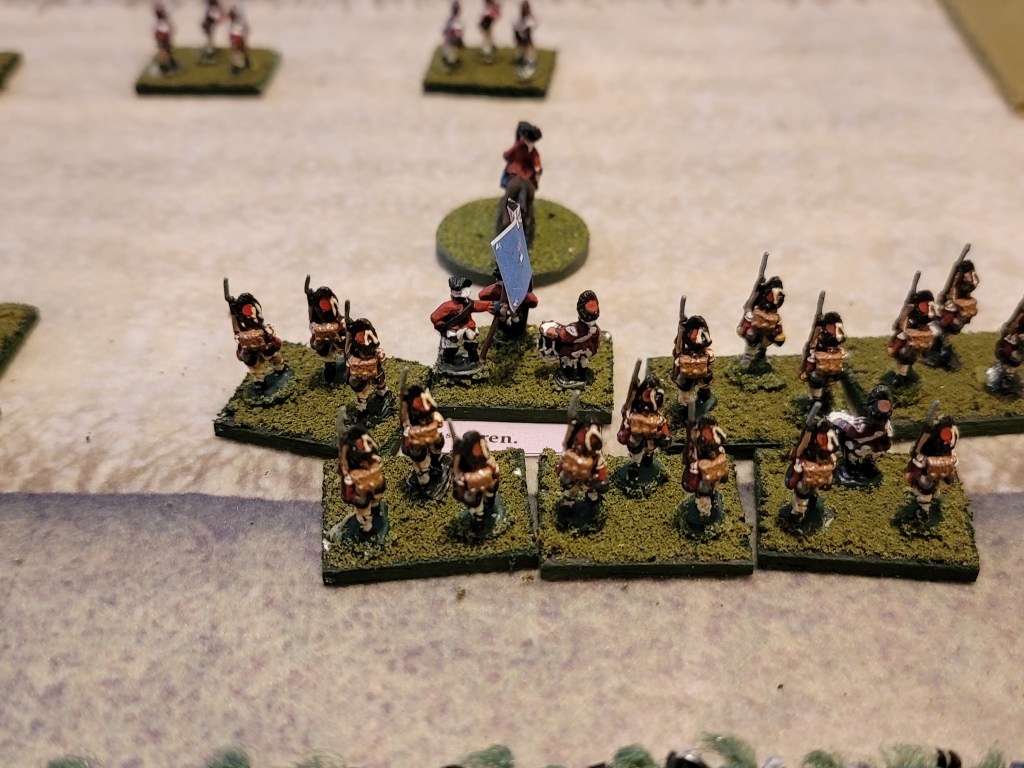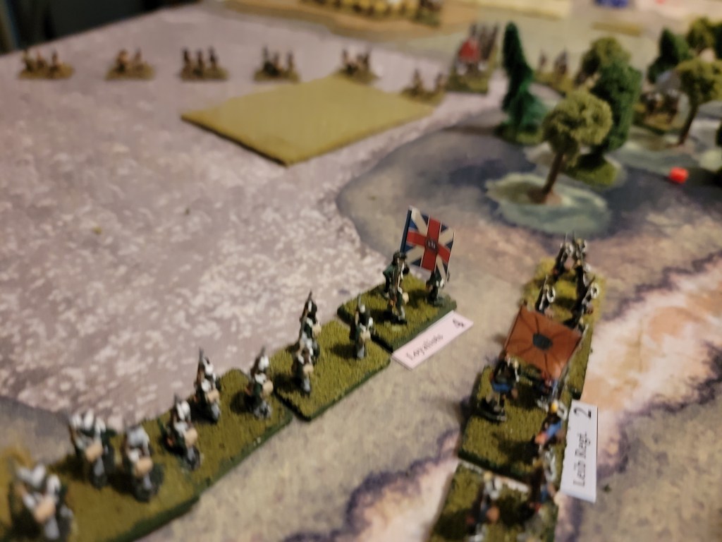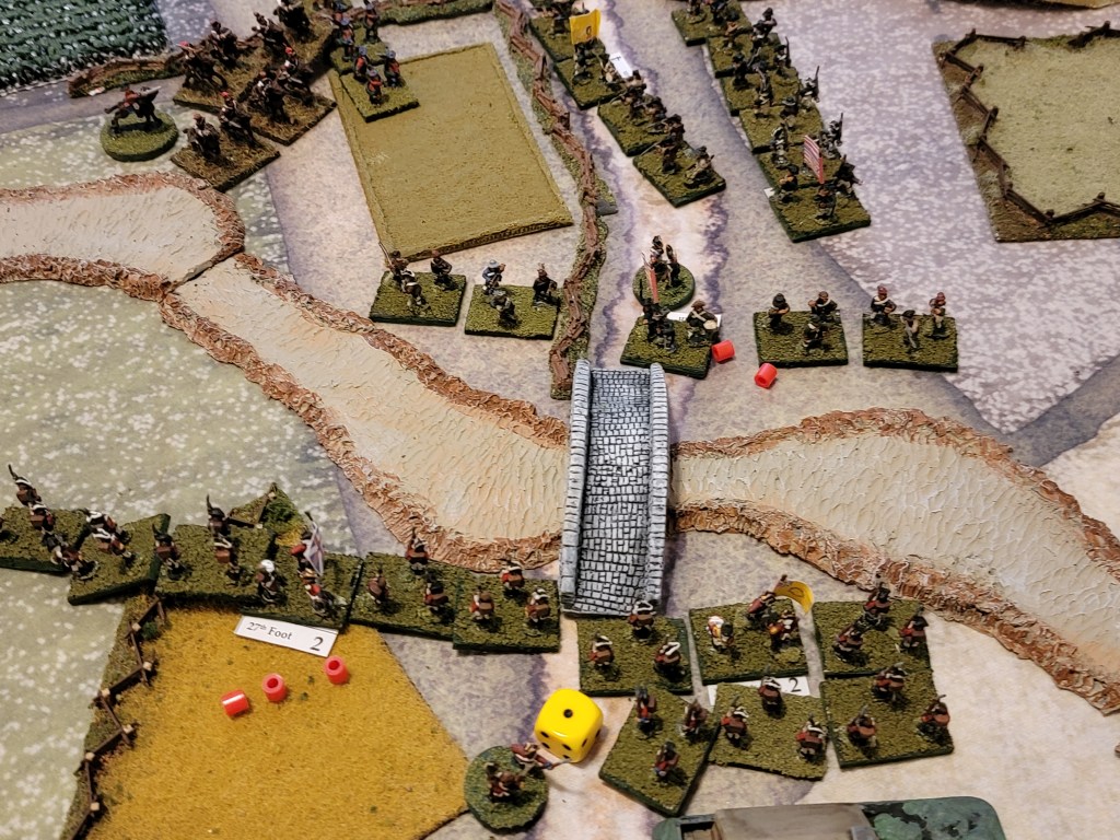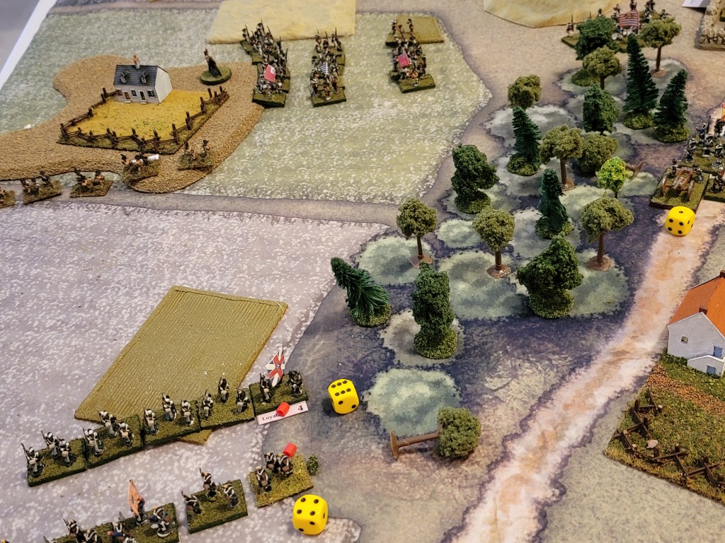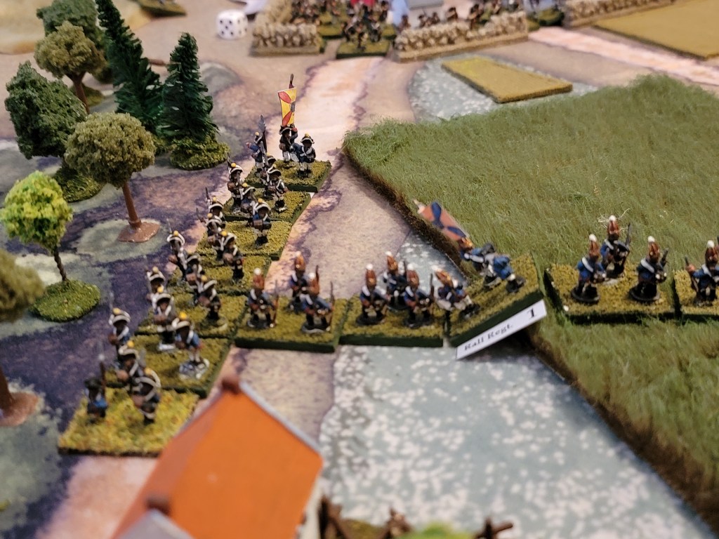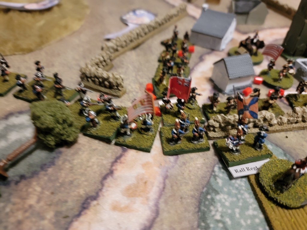 As usual, I don’t have a ton of time to describe the play by play but I did want to share the images. In short, the British (commanded by me) rushed toward Sutton, using the single battalion of lights to screen my battalions, with von Rall’s brigade securing the left along the woods. In the east around Compton’s Corner, Leslie rushed headlong to displace the one battalion of MA militia across the river. Of all the British brigades Leslie had the most success.