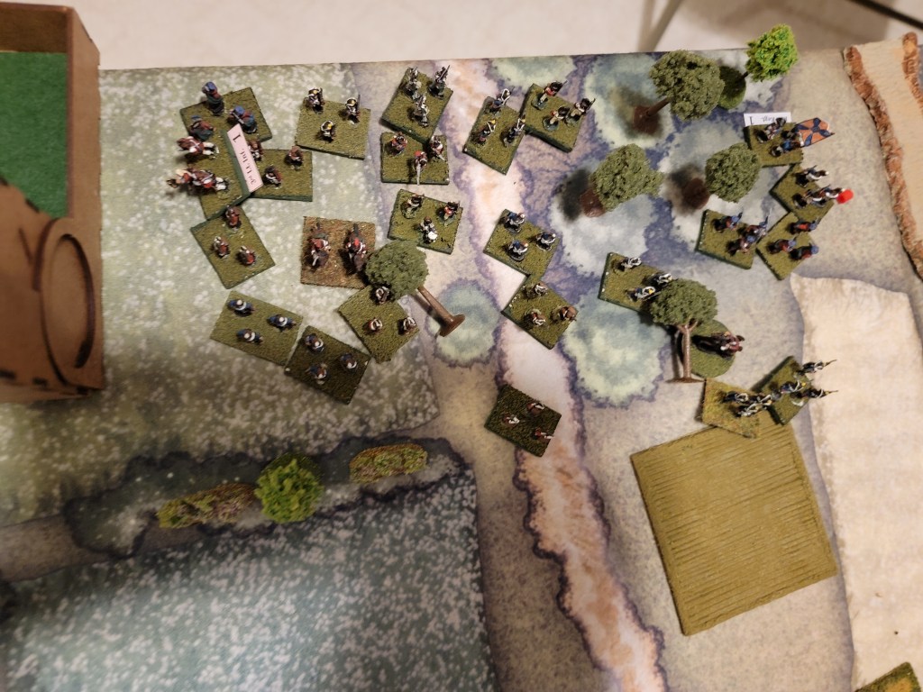 As it happens, other than painting up a couple of units and basing some of them, these fellows sat in their patient ranks in the storage cabinet with many other armies. However, in the last day or so my son pointed out that he only had a handful of days he could play a game during the fall band season, so I cobbled this together.
