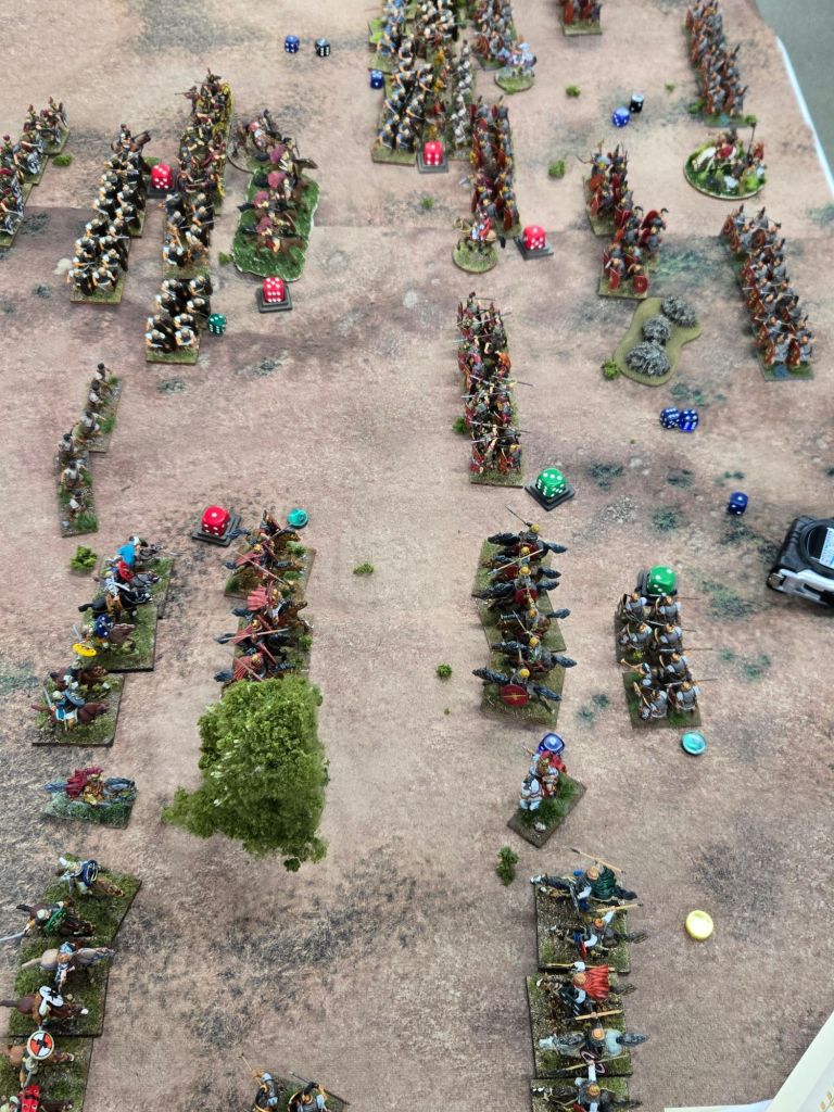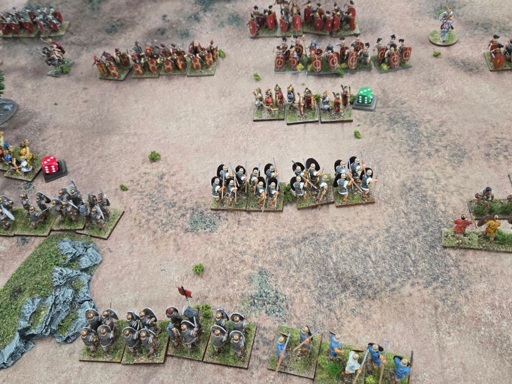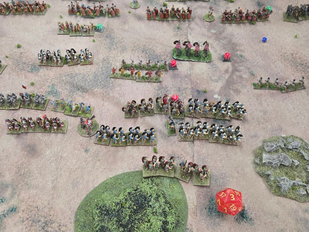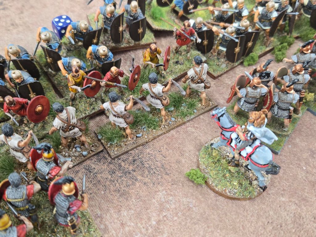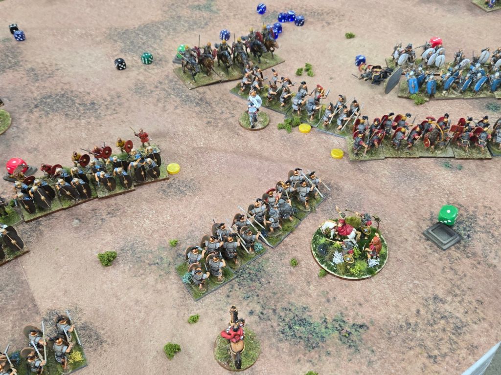 Amusingly, on Turn 8 Caesar was attached to his Gallic cavalry to add dice to a critical attack on the Republican’s only veteran legionary unit. When it came time to check leader casualty, the dice came up 11 – plus the three he used in the combat, and down went Caesar. Fortunately for history perhaps, he rolled a 4 on the result, so while injured, he wasn’t ended.